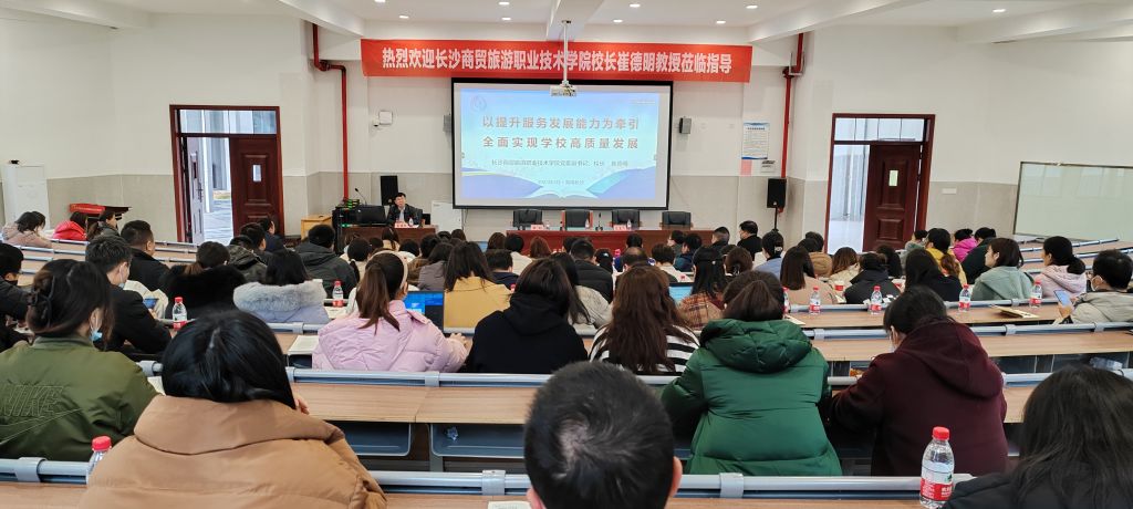 为推进学校“双高”建设,促进学校内涵提质,3月21日下午,我校邀请长沙商贸旅游职业技术学院校长崔德明教授在德馨楼132阶梯教室进行“以提升服务发展能力为牵引,全面实现学校高质量发展”专题讲座,副校长文孟飞、全体行政干部、专业带头人、教研室主任及高水平专业群团队成员等参加,其他教职员工线上学习,会议由校长李毅主持。