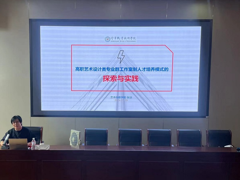 下午,金华职业技术大学艺术创意学院张剑教授从工作室制人才培养模式的现状分析、金职实践及艺术学院工作室制的实践案例三个方面分享高职艺术设计类专业群工作室制人才培养模式的实践经验,并详细解答老师们的相关疑问。