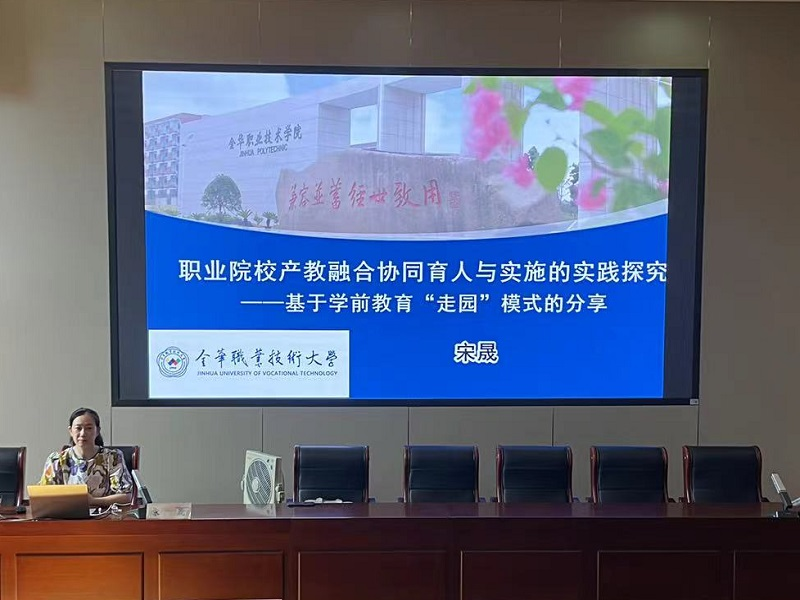 7月9日上午,金华职业技术大学学前教育专业副主任宋晟以《职业院校产教融合协同育人与实施的实践探究——基于学前教育“走园”模式的分享》为题,先从政策要求、岗位要求、实施指导三方面解读相关重量级文件、标准对高职高专学前教育专业教育实践的要求,然后以金华职业技术大学学前教育专业“走园”的实践教学模式为例,讲解如何针对学习与实践的割裂、教师培养体系与幼儿教育体系的分离、见习与实习难以衔接等问题构建出“走园”模式。