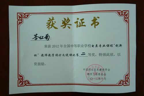 我校青年教师李红菊参加全国中等职业学校电类专业课程“创新杯”大赛中,以优异的成绩,夺得教师教学设计及说课比赛二等奖。这次比赛云集了全国的职教精英,李红菊老师凭借她出色的发挥,创造佳绩,为学校争光添彩。希望全体教师在教学工作中锐意进取,创先争优,为学校发展作出贡献。