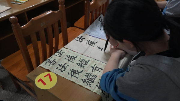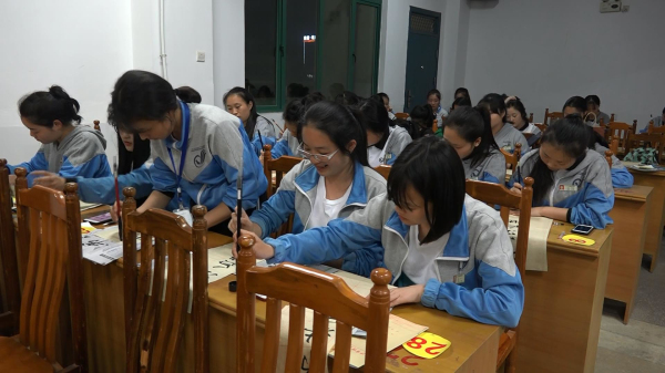 此次书法技能比赛参加者多且学生积极性高。比赛现场,学子手握丹青,端坐于桌前恣意书写,小篆、楷书、隶书,字字入心入目,吸引了不少老师们驻足观看。