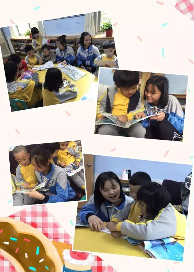 孩子来到了阅览室,这里悄然有序,见习老师蹲身下去正与孩子们一道阅读。