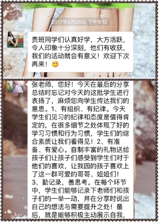 返校后,彭园长和尹主任再次发微信,对本次学生见习,给予肯定和表扬。