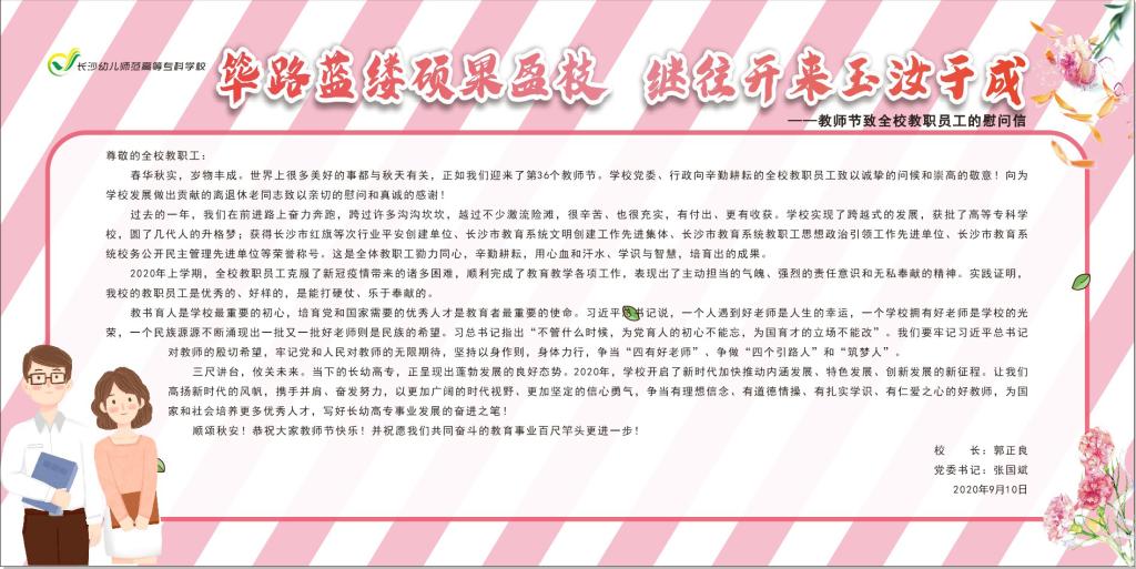 春华秋实,岁物丰成。世界上很多美好的事都与秋天有关,正如我们迎来了第36个教师节。学校党委、行政向辛勤耕耘的全校教职员工致以诚挚的问候和崇高的敬意!向为学校发展做出贡献的离退休老同志致以亲切的慰问和真诚的感谢!