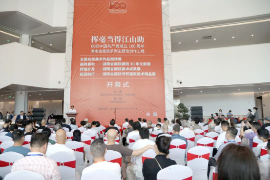 9月29日,由湖南省文联、湖南省画院主办的“挥毫当得江山助·庆祝中国共产党成立100周年——湖南省画院系列主题性创作工程展”在湖南美术馆开幕。据悉,此次展览将持续至10月18日结束,面向公众免费开放。此次展览是湖南省文联庆祝中国共产党成立100周年的一项重要活动,是湖南文艺界、美术界的一件大事、盛事,也是庆祝湖南省画院成立30周年的一项重大主体活动。展览由“全国名家美术作品邀请展”、“画院春秋——湖南省画院建院30年文献展”、“辉煌岁月——湖南省画院美术成果展”、“砥砺前行——湖南省画院专职画家美术精品展”四部分组成,共展出410余件(幅)作品,旨在向广大观众展现湖南省画院的成长。省委宣传部常务副部长蒋祖烜,省委宣传部副部长、省文明办主任肖凌之,湖南省文联党组书记、副主席夏义生,中国书协副主席、湖南省文联主席、湖南省书协主席鄢福初,湖南省财政厅党组成员、副厅长陈博彰,中国国家博物馆书画院院长刘罡,中国国家画院院办主任、国画专业委员会副主任于文江,湖南省文联党组成员、副主席唐贵平,湖南省文联党组成员、副主席、秘书长邓清柯,省文联党组成员、副主席张纯出席或观展。