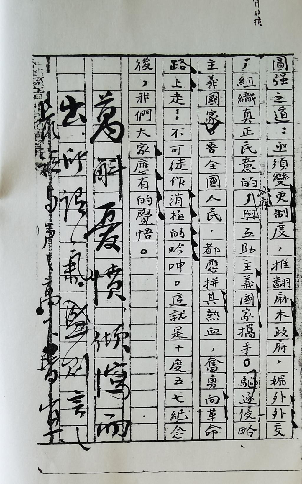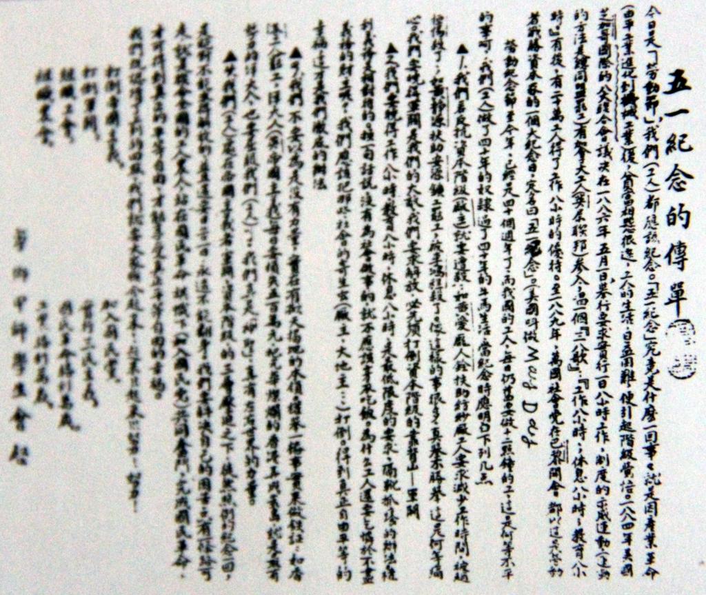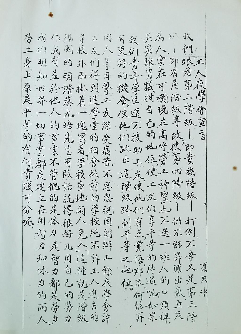(甲师学生会自治会夏尺冰写的《工人夜学会宣言》 原件现存学校校史办)