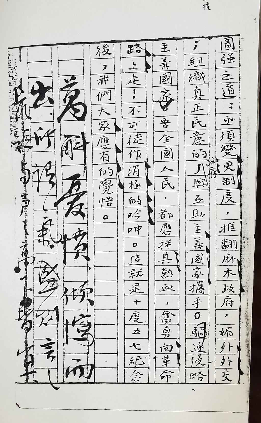 图强之道:亟需变更制度,推翻麻木政府,媚外外交;组织真正民意的(政府),与互助主义国家携手,驱逐侵略主义国家。吾全国人民,都应拼其热血,奋勇向革命路上走!不可徒作消极的吟呻。这就是十度五七纪念后,我们大家应有的觉悟。