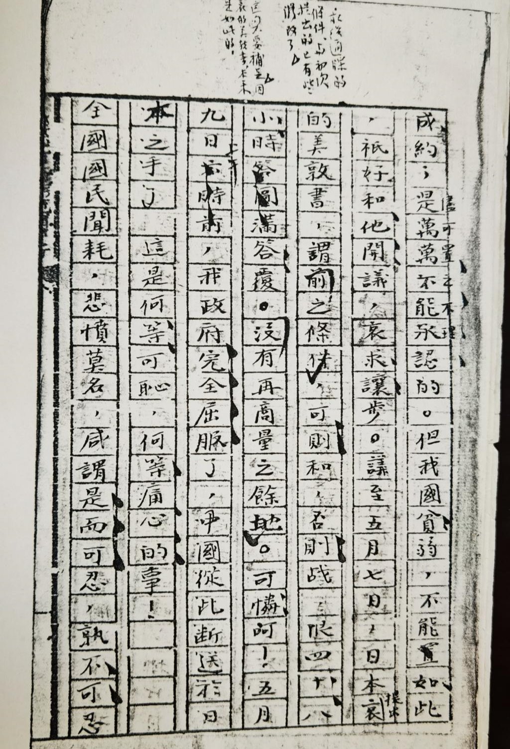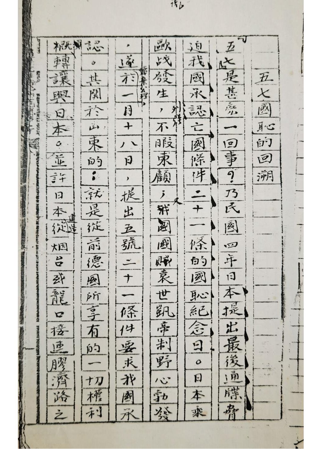 乃我国政府麻木,外交媚外,日本侵略,现总觉悟;英法美各国经济侵略,反与(他)亲善。堕入其计中而不自知。外交总长顾维钧极端亲美,美国几成一言听计从之顾问。不知他之(所)言,不是抑制中国,就是侵害中国。列位!我国土地有限,主权有尽。一国侵略,尚有覆亡之惨,况数国环而侵略呢?我们每年办国耻纪念,国家耻辱日见增多;长此以往,我纪念到不胜纪念,国耻何日得雪?所以我们应改变方针,莫徒作消极事业的救国(改为“做适当的抵抗”)。我看中日交涉,要根本解决,我国耻要彻底雪除,非自图强盛,战胜倭奴和列强不能。图强之道,必当这国内许多问题,还未解决以前——就是还没有力量和日本列强打仗以前;决非经济绝交,年年口里说纪念(改为“毋忘”)国耻所能做到的。我们要做到必须(改为“除”)自图强盛,战胜倭奴和列强,没有第二条路可走。