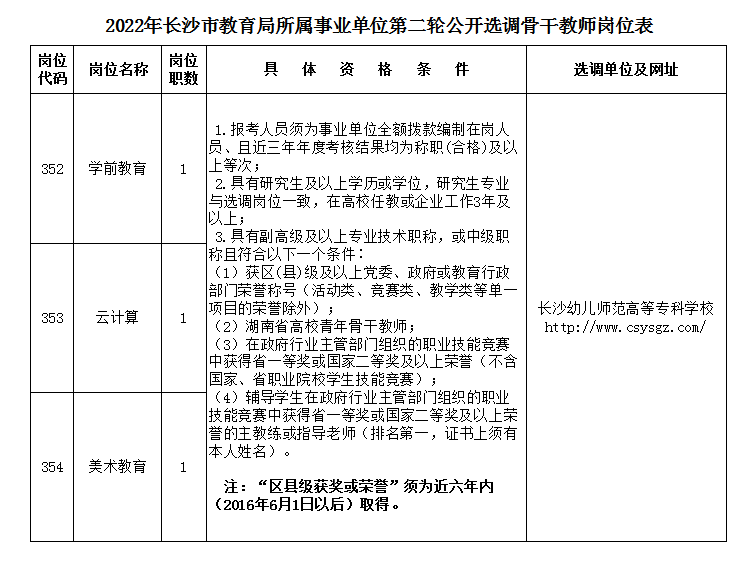 (4)符合《2022年长沙市教育局所属事业单位第二轮选调骨干教师岗位表》(见附件2,以下简称为“《岗位表》”)“具体资格条件”中的资格条件;