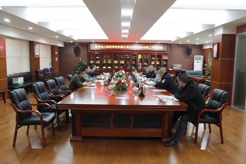 为深入贯彻落实全国及省、市学校及周边治安综合治理工作会议会议精神,进一步完善学校及周边治安综合治理工作管理机制,积极推进学校及周边治安环境建设,努力营造安全、文明、和谐的学校及周边环境。1月8日下午15:00,长沙幼儿师范学校校园及周边治安综合治理工作联系会在道馨楼四楼广益厅召开。同升街道办事处公共安全办主任陈潜、同升街道办事处城管队长李峰松、白田社区居委会主任汤力、同升派出所教导员杜定湘、同升派出所副所长余磊、同升派出所辖区民警臧克建、雨花区公安分局内保大队副大队长胡步勇、职教基地协调办主任戴伟军、职教基地协调办综治科长邓敏杰、洞井社区卫生服务中心副主任黄昭兹、长沙幼儿师范学校副校长文孟飞、长沙幼儿师范学校保卫科副科长朱志成、戴申林参加了本次会议。会议由长沙幼儿师范学校副校长文孟飞主持。