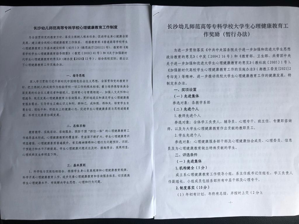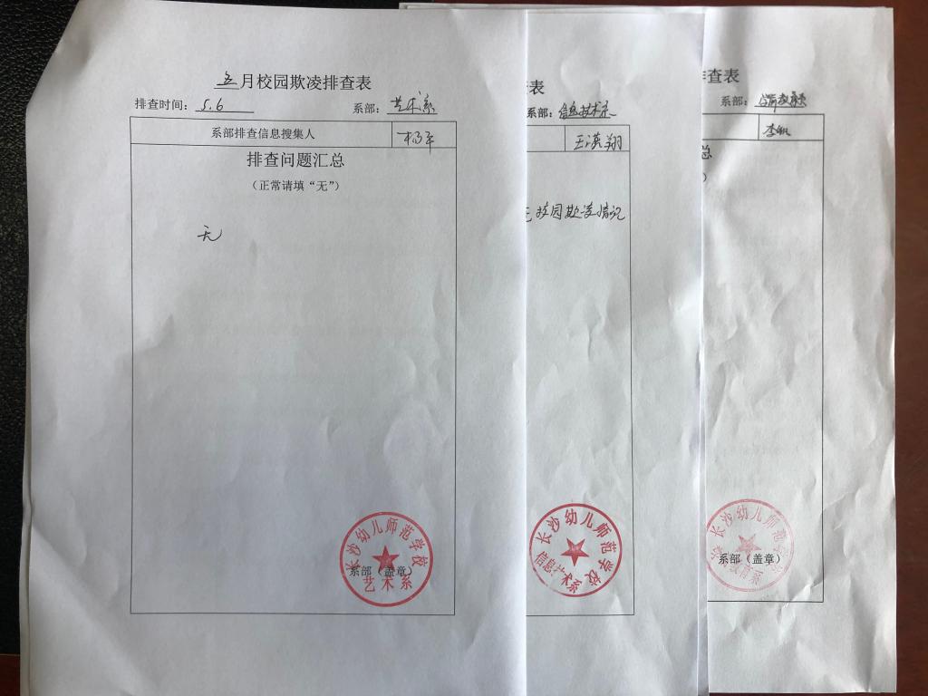 深入开展防学生欺凌。接到任务后,学校第一时间反应,各部门相继开展相关活动。其中,安全保卫处再次修订了《预防校园欺凌事件应急处置预案》、《学生欺凌治理委员会》,学工处再次修订了《长沙幼儿师范学校学生违纪处分条例》。通过制度完善,进一步明确了相关岗位教职工防治学生欺凌的职责、学生欺凌事件应急处置预案、学生欺凌的早期预警和事中处理及事后干预的具体流程、校规校纪中对实施欺凌学生的处罚规定等。