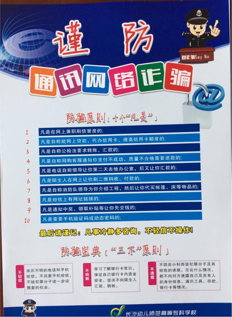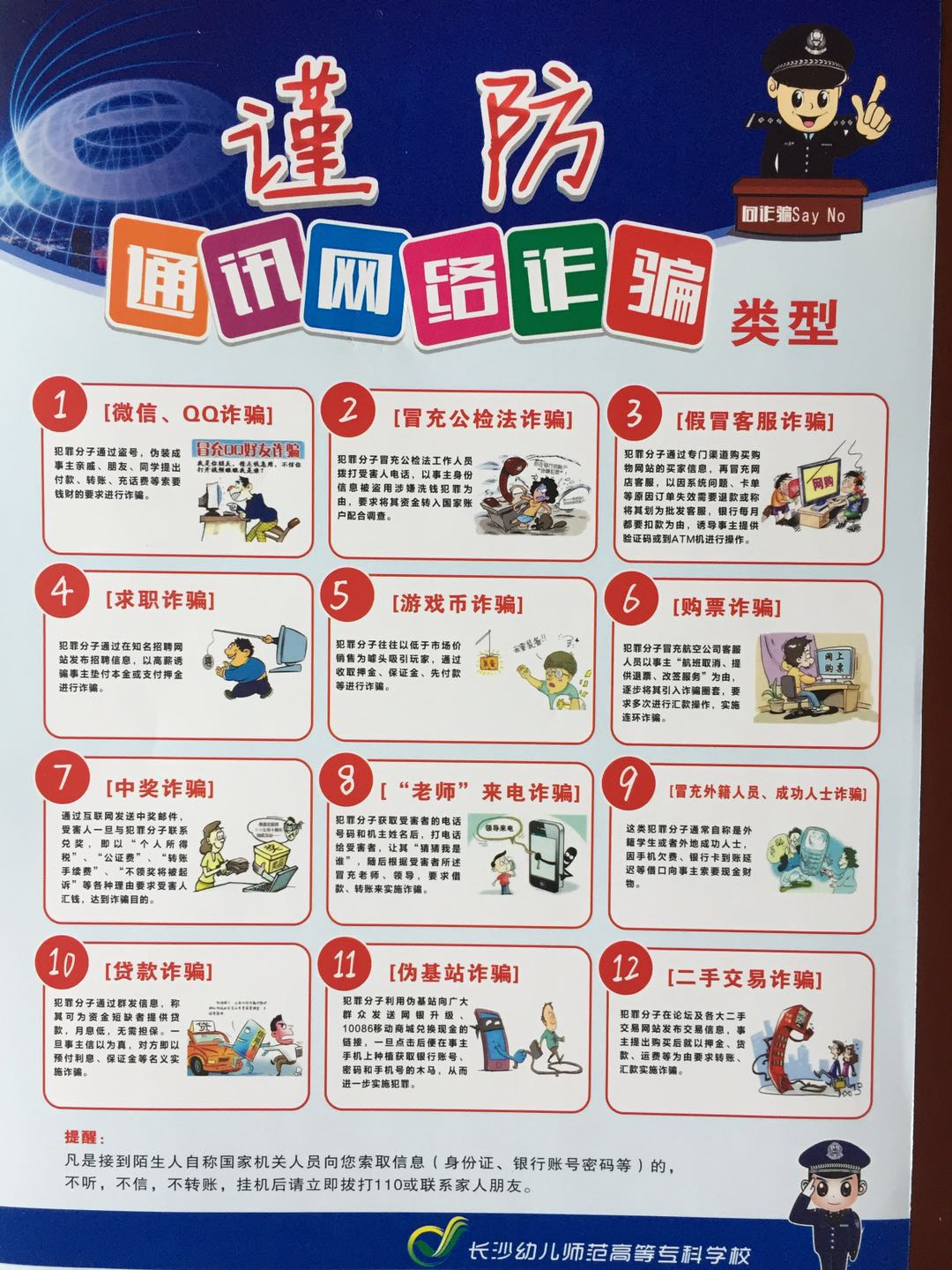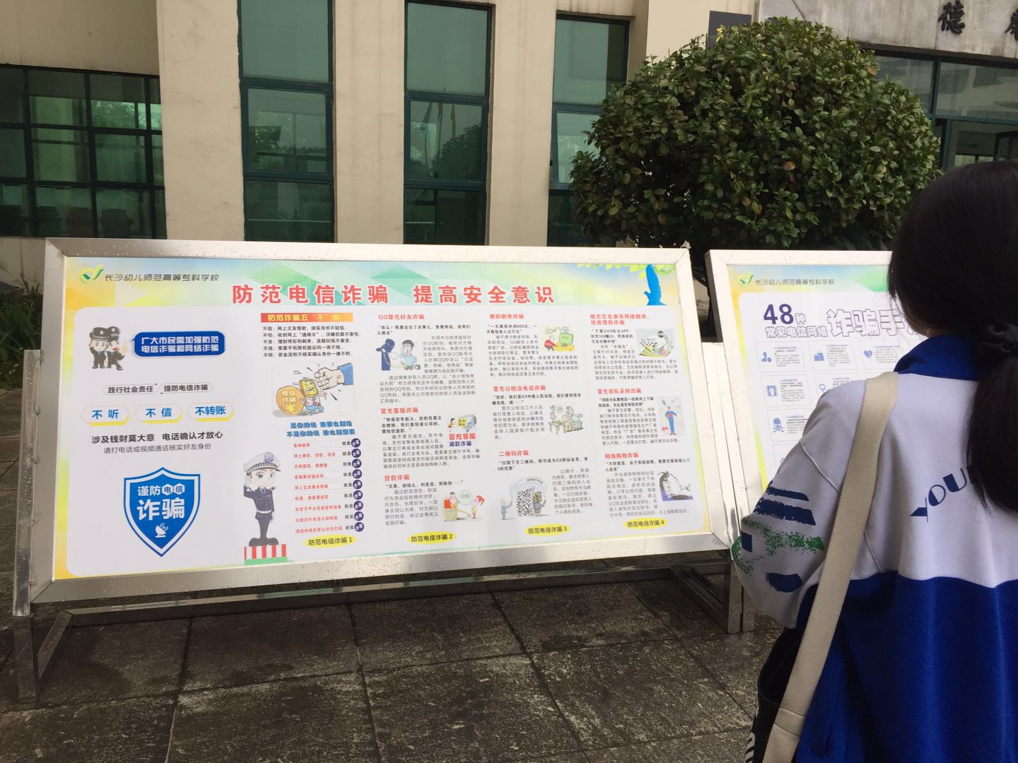 本次宣传活动是学校开展的防范电信网络诈骗专题安全教育系列活动之一。前期,为了使师生的防诈骗意识能够入耳、入脑、入心,学校加大各种宣传力度,切实将反电信诈骗工作落到实处,更加具体地落实领导负责,明确任务分工,强化检查督导,特别是在班会期间由老师统一宣讲反电信诈骗知识,确保宣传全覆盖。学校各职能部门各司其职、齐心协力,确保防范电信网络诈骗工作有力推进,为我校2020年“平安校园”建设打好谋篇布局持久战。