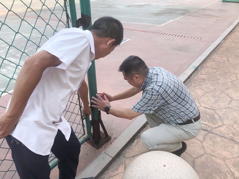 “这个铁架子都摇得动,要不得,有安全隐患,要总务处维修。”文孟飞对相关负责人说道。