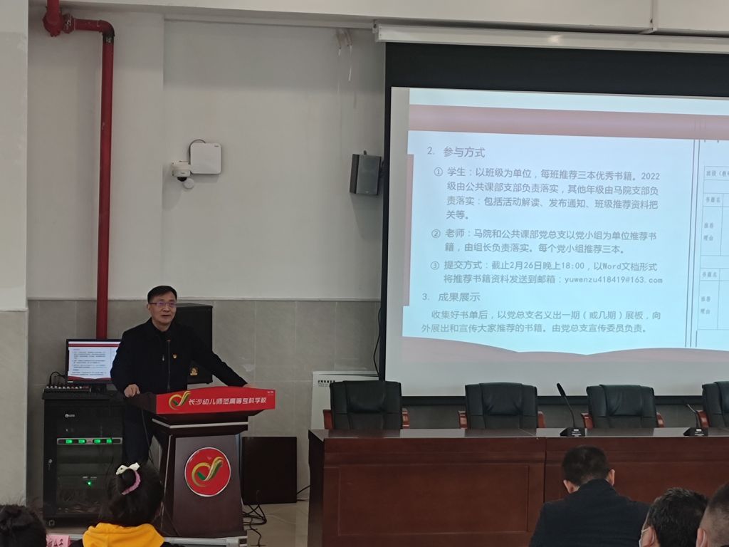 紧接着是部署阅读书单征集活动。王锐从“楚怡读书行动”的活动出发,结合我校实践向大家发出号。马院党支部书记李立华从努力建设书香校园,激发学生阅读兴趣,营造乐于阅读的学习氛围等方面阐述开展本次书单征集活动意义,以“让阅读像呼吸一样自然”为活动主题,向党员同志发出号召,希望大家推荐自己最喜欢的书籍,让我们的推荐成为别人翻开此书、爱上此书的理由。