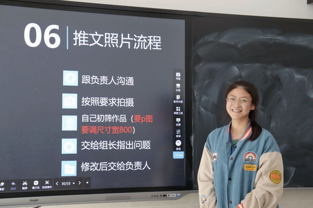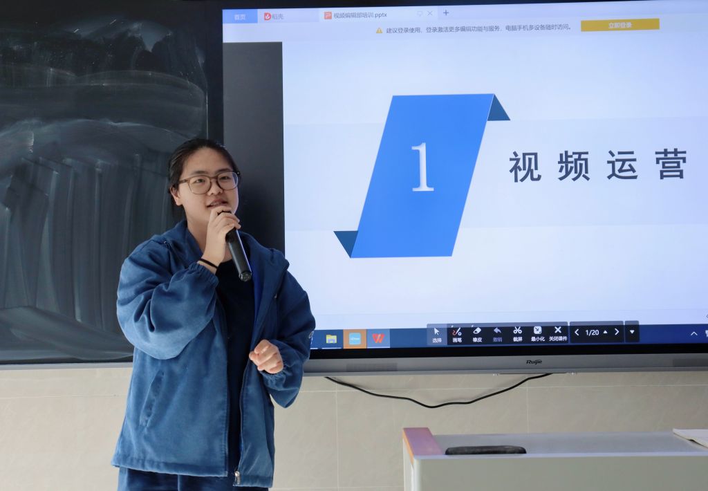 运营部部长唐舒婷结合一篇具体的推文,演示了96编辑器的使用方法;视频编辑部部长曾希怡介绍了视频拍摄、剪辑技巧;摄影部部长李嘉敏结合学校公众号图片,分享了拍摄经验,要求拍摄内容要有美感、主体分明;采编部谢明君、孙媛、杨颖漪、郑苓介绍了新闻的分类、结构要求、写作技巧和注意事项。