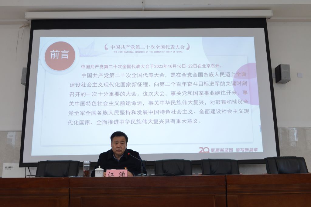 报告会上,江涌以《谱写新时代中国特色社会主义更加绚丽的华章》为题作专题宣讲,重点围绕全面领会党的二十大主题及主要成果、深刻认识新时代十年的伟大变革及其里程碑意义、不断开辟马克思主义中国化时代化新境界、牢牢把握新时代新征程中国共产党的使命任务、贯彻落实新时代新征程的战略部署、用新的伟大奋斗创造新的伟业六个方面,对党的二十大精神要义进行了系统阐释和深入解读。