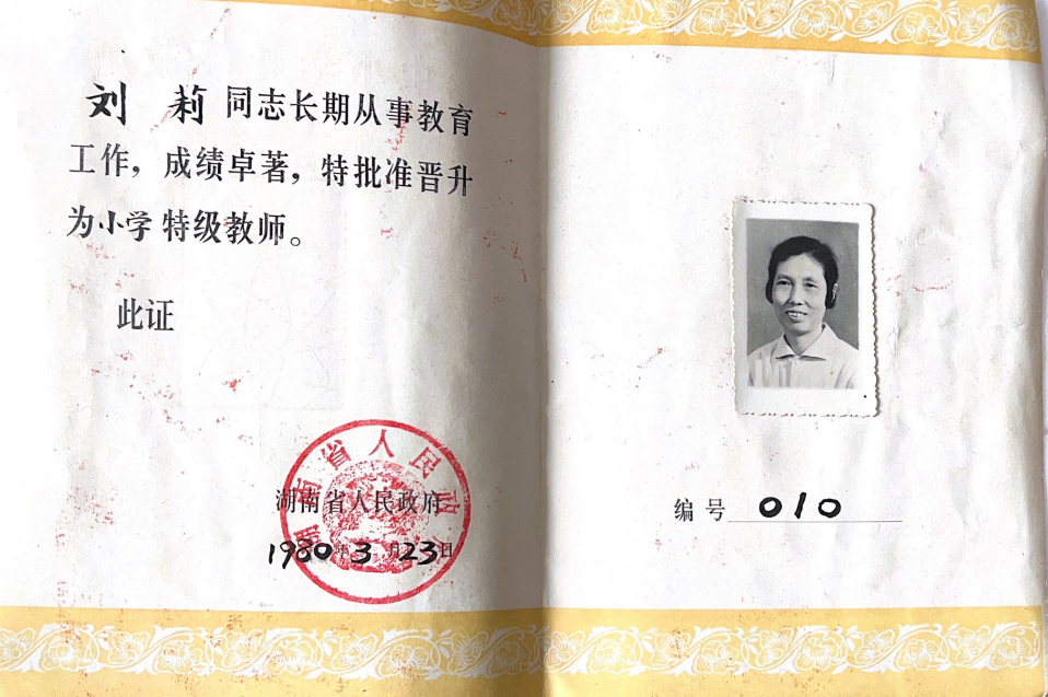 1951年👨🏻,刚刚从宁乡师范学校毕业的刘莉就踏上了小学课堂的讲台,那时的她或许未曾想到,从此以后她便与祖国的教育事业紧紧地联系在了一起,乃至再也未走出过这片校园🔧。在两张泛黄的纸页上,我们看到了一份材料🌑,那是在1978年宁乡县先进个人代表大会上刘莉老师对自己27年教育工作的总结。“先进个人”是她应得的荣誉,这份总结也是一个教育工作者最真挚的文字展示📠。然而我们却知道,在这两页简单的纸张之外🆑,还有更多她未曾写下的东西✬。