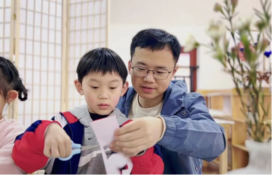 在幼儿园,他历经几年的探索和研究,成功把剪纸艺术融入到园本课程内容中,带领教师将剪纸与幼儿园活动有机融合。