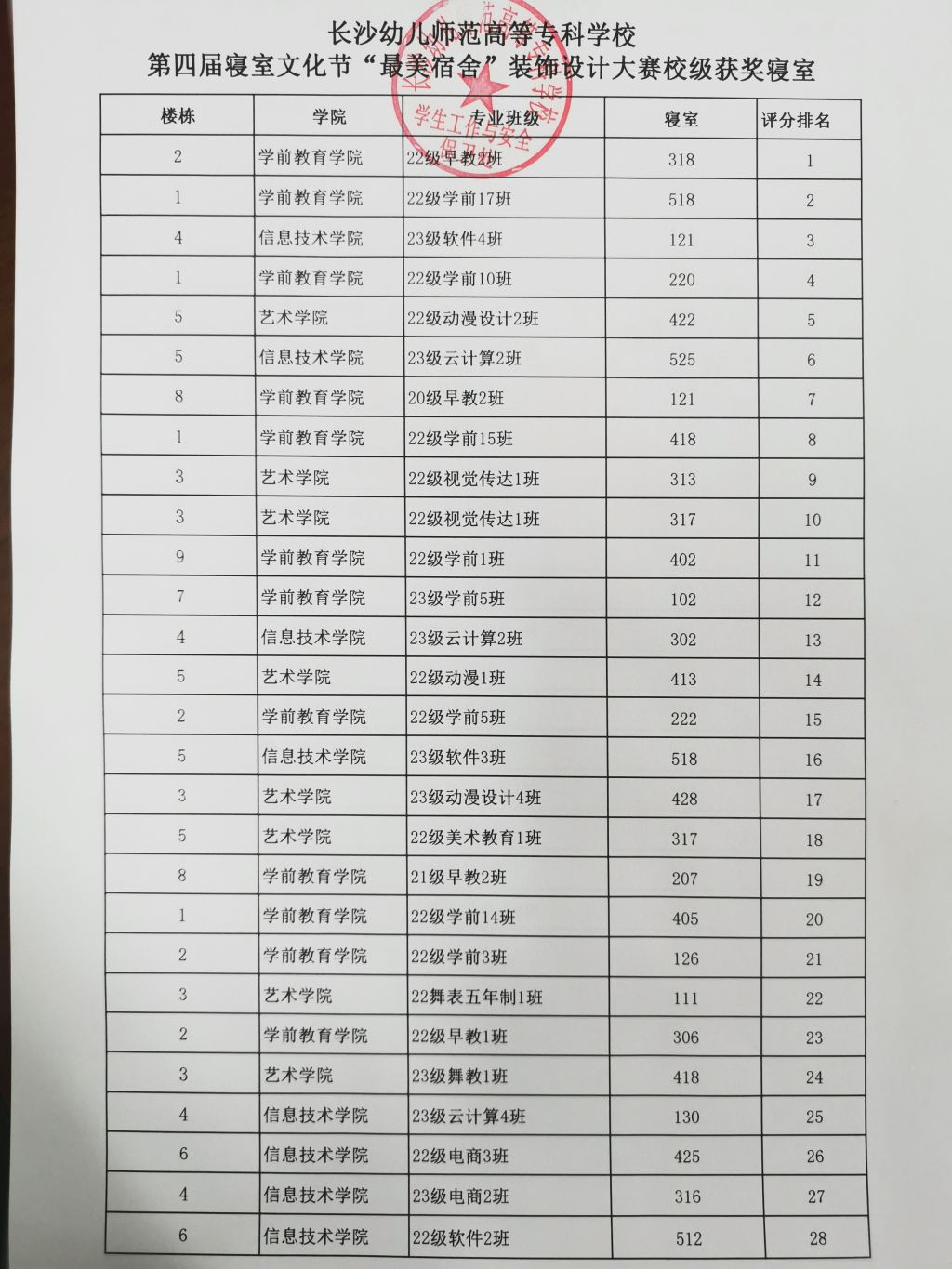 神彩争霸8安卓下老版本第四届寝室文化节“最美宿舍”装饰设计大赛自2023年11月启动,经各寝室成员申报、宿管老师审核、辅导员批准、各学院组织评比,于12月15日评选出100间院级“最美宿舍”,学保处于12月19日组织11位评委进行现场评比,最终评选出50间校级“最美宿舍”,名单公示如下,公示期为2023年12月19日--12月21日。如有异议,请到道馨楼215室田老师处进行反馈。