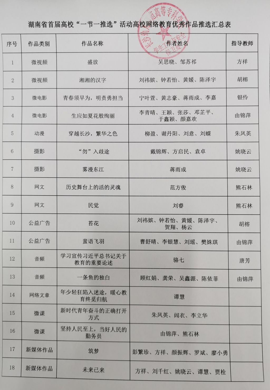 湖南省首届高校“一节一推选”活动于2023年10月启动,在各学院的积极组织发动下,截止到12月21日共收到10个项目共计54件作品,学保处组织相关老师进行盲评,共评选出18个作品参加省赛,现将评选结果公示如下,公示期为2023年12月22日--12月25日。如有异议,请到道馨楼208室廖老师处进行反馈。